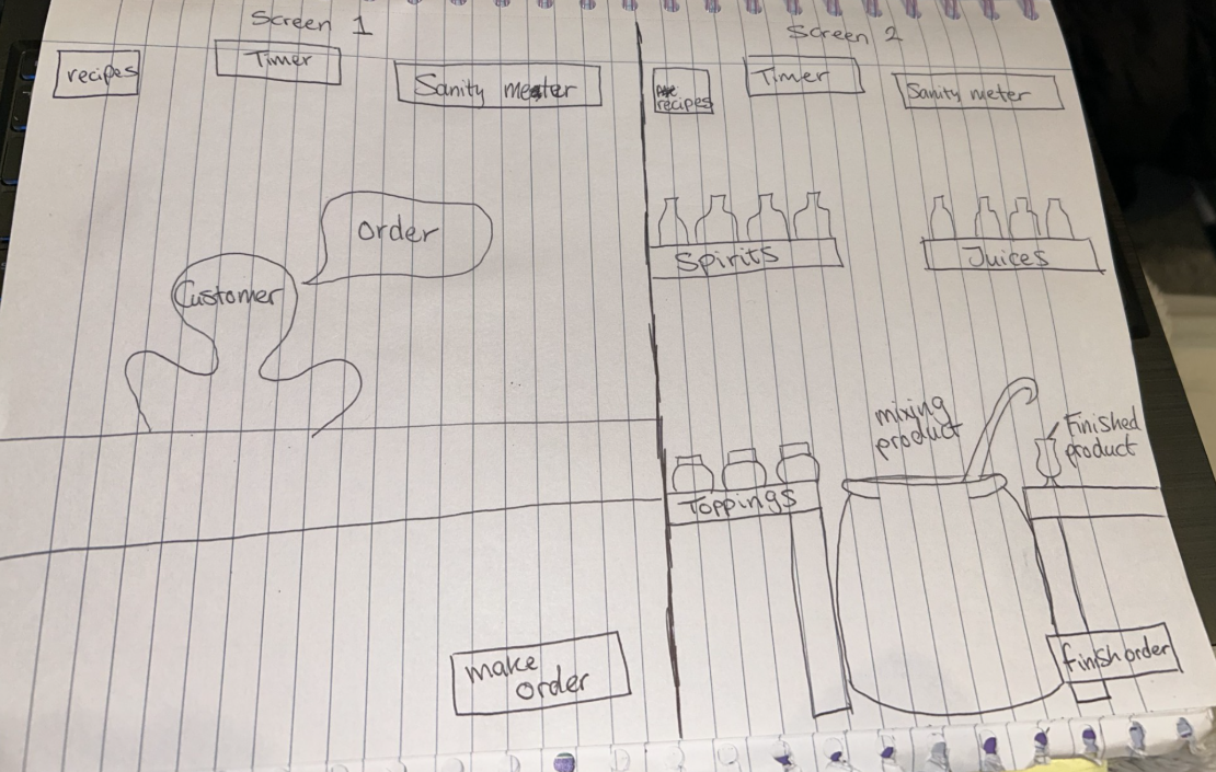 After week 3's playtest on my prototype animation on how the game would look, most feedback given was that they didn't like how the ordering screen was just a picture or how there were too many screens to change to, so I decided to change the game's design completely, starting with changing the game to two screens instead of 4 or 5, and then the ordering screen will be an actual customer waiting at your bar for you to take their order.